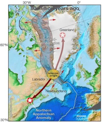 A similar zone of hot rock beneath north-central Greenland may be the NAA’s long-lost twin. The researchers believe it also emerged from the Labrador Sea breakup, but on the opposite flank.