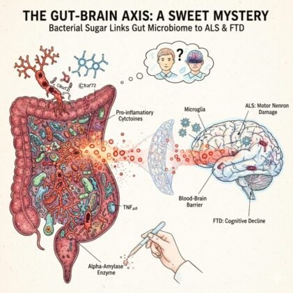Burberry and his team have now traced the problem to something deceptively simple: a type of sugar called glycogen, produced by certain gut bacteria, that triggers an immune cascade capable of breaching the blood-brain barrier and damaging neural tissue. The discovery, published in Cell Reports, could reshape how we think about two of the most devastating neurological conditions, amyotrophic lateral sclerosis (ALS) and frontotemporal dementia (FTD), by pointing to the gut microbiome as a modifiable trigger for brain disease.