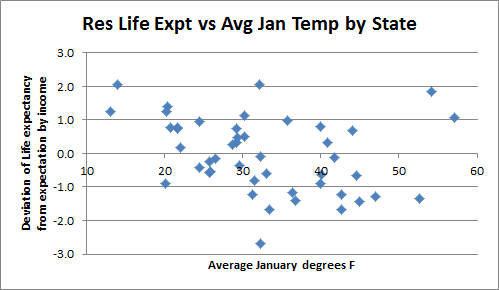 After removing the effect of income, I plotted the residual variation in life expectancy against January temperature, and lo and behold, results were a bit more significant than the relationship for raw life expectancy (R2=0.16, p<1*10-5).